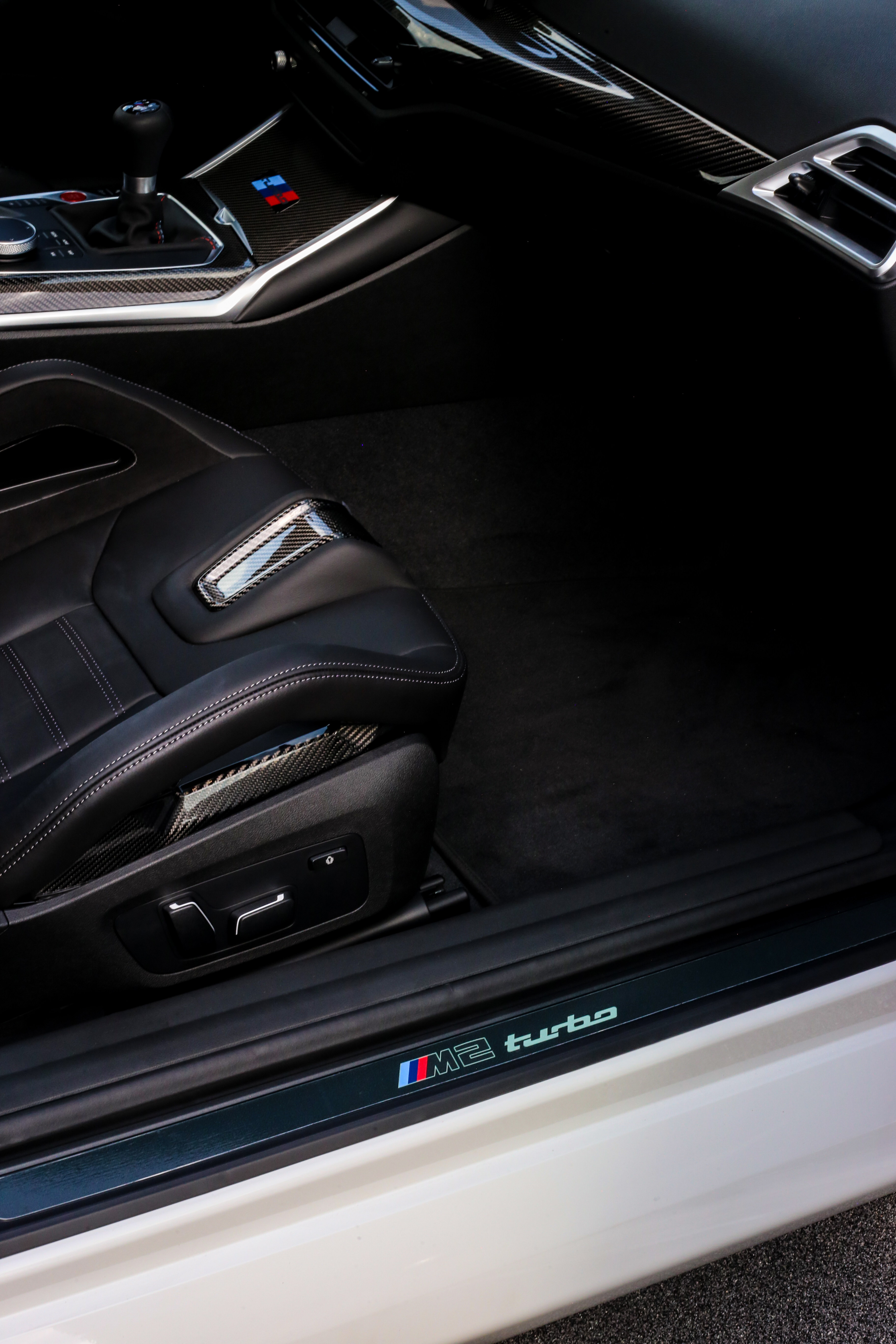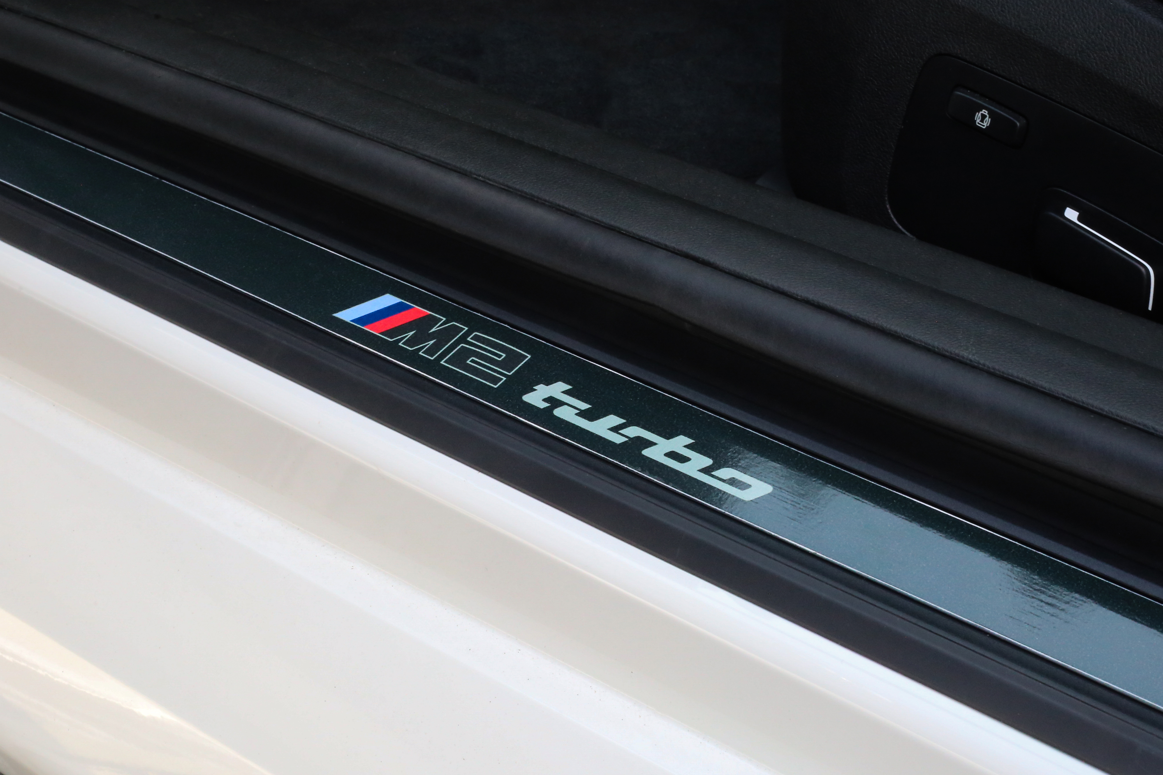 Opening the doors, the driver and passenger are greeted with unique sill plates emblazoned with “M2 turbo” script. Standard M sport seats are trimmed in Black Vernasca Leather with M Color Highlight – a callback to the striping on the exterior. M Carbon bucket seats, also finished in Black with M Color Highlight, are optional.