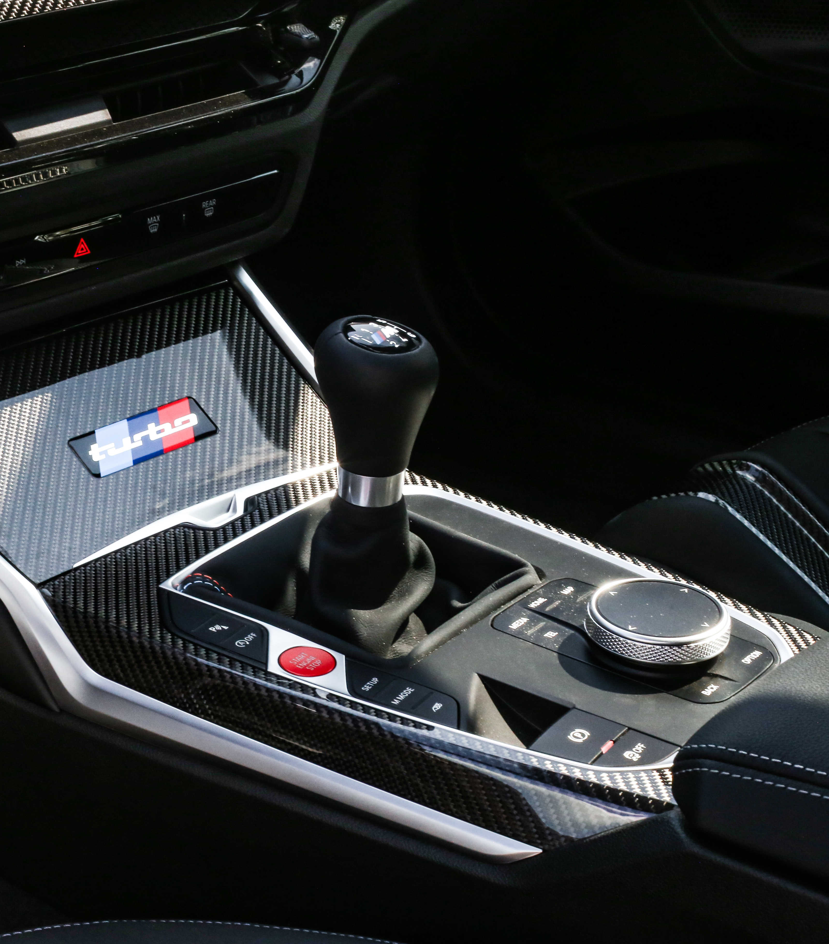 The original 2002 turbo was fitted with a standard 4-speed manual or an optional 5-speed manual transmission, so it’s appropriate that the the M2 Turbo Design Edition comes exclusively with a 6-speed manual. Ahead of the shifter on the cup holder cover is a plate with “turbo” inscribed over an M stripe background. The driver faces a standard heated M alcantara steering wheel.
