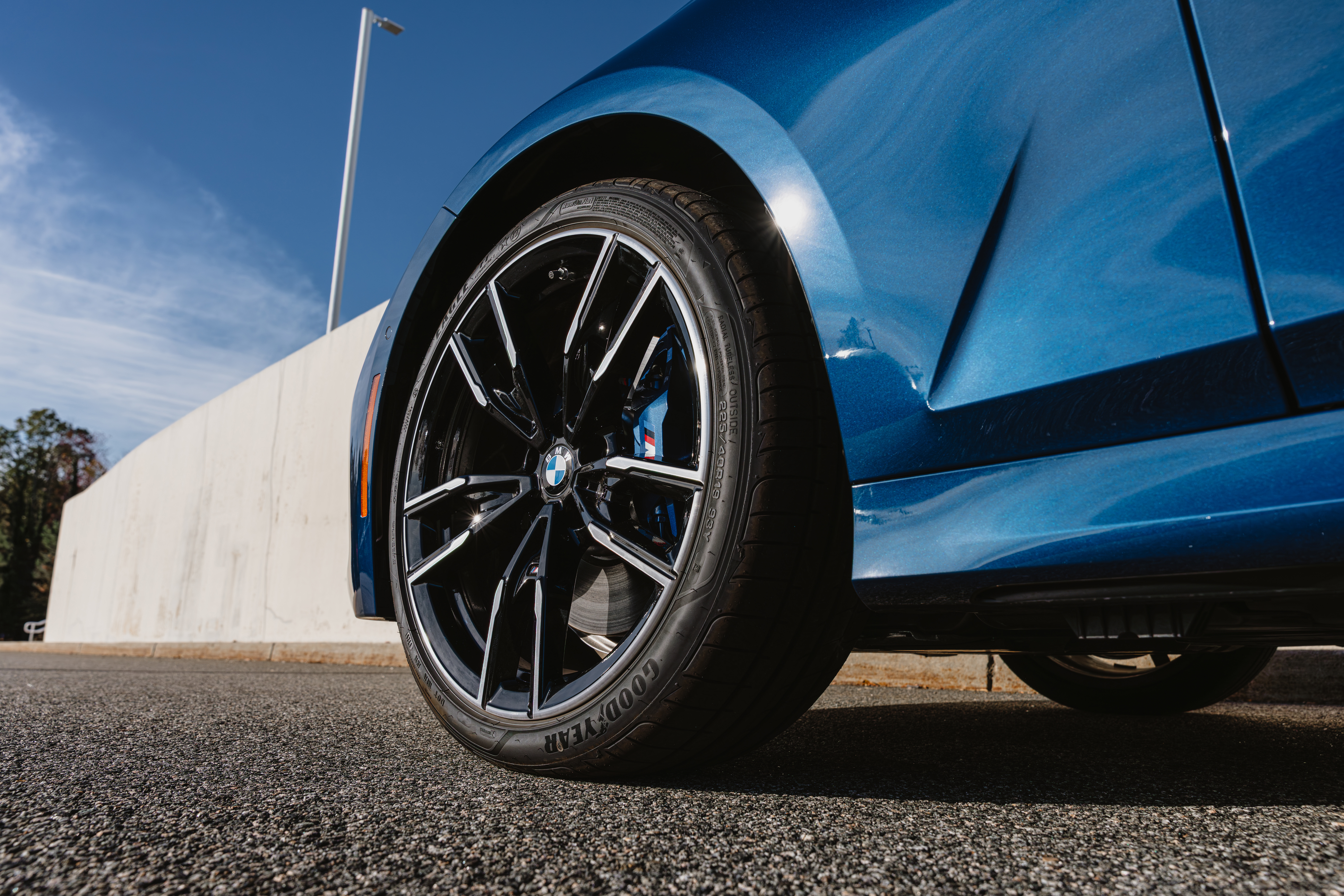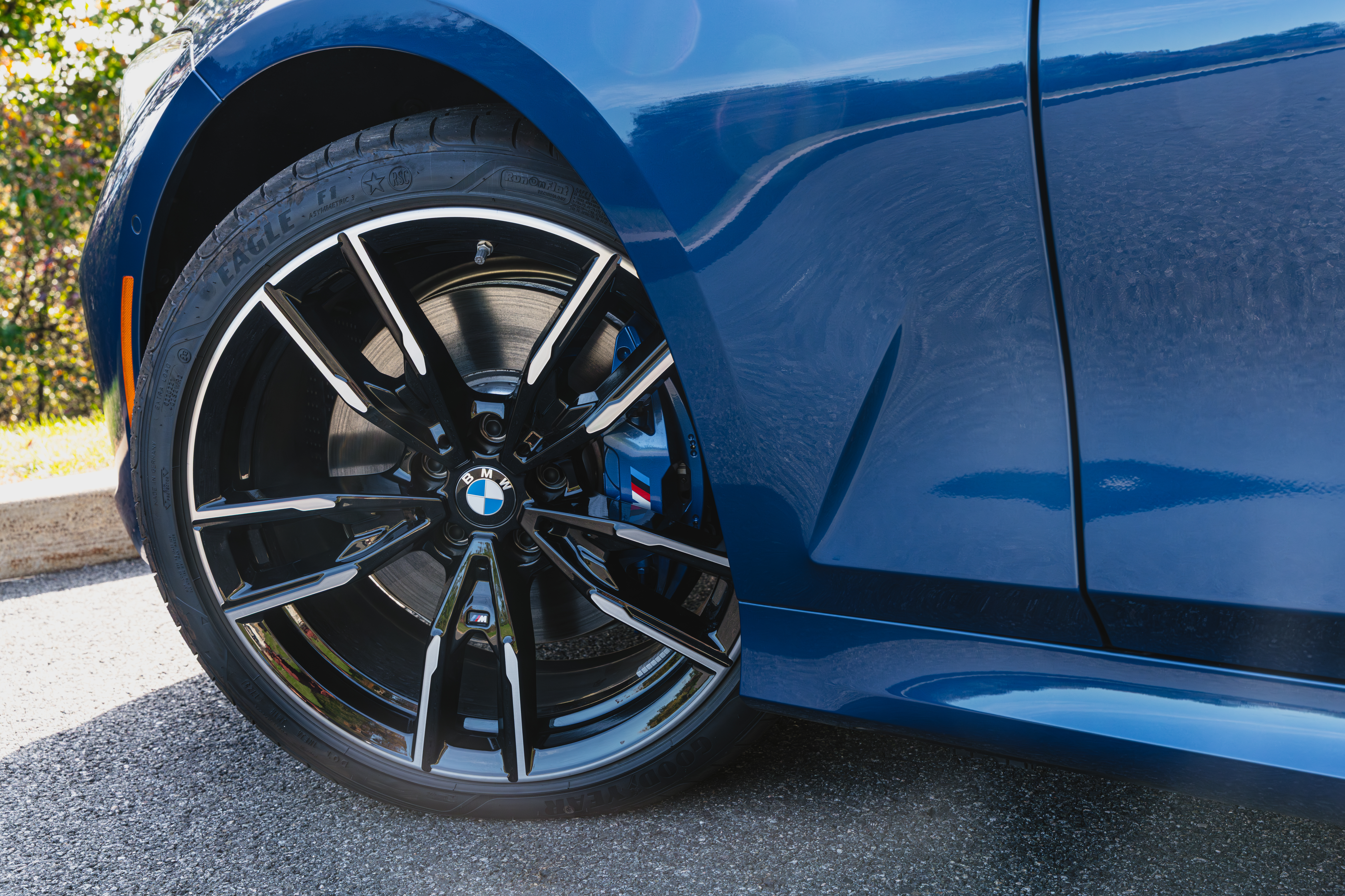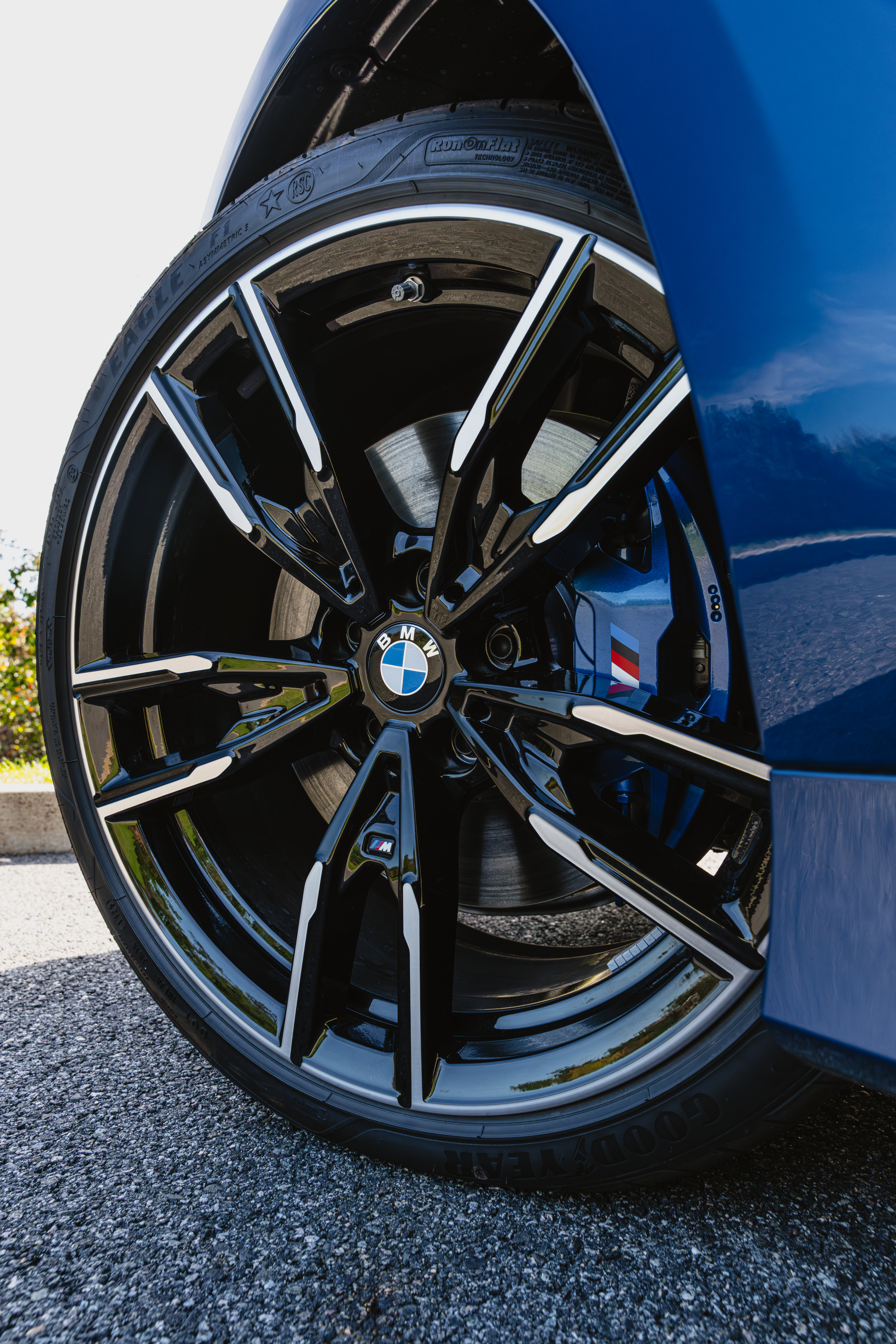 The 50 Jahre Edition announces its presence through a dual-branch M Performance exhaust system with Shadowline tailpipe finishers. At each corner is a 19-inch M Dual-spoke Bicolor Black 792M wheel mounted on an all-season runflat tire.