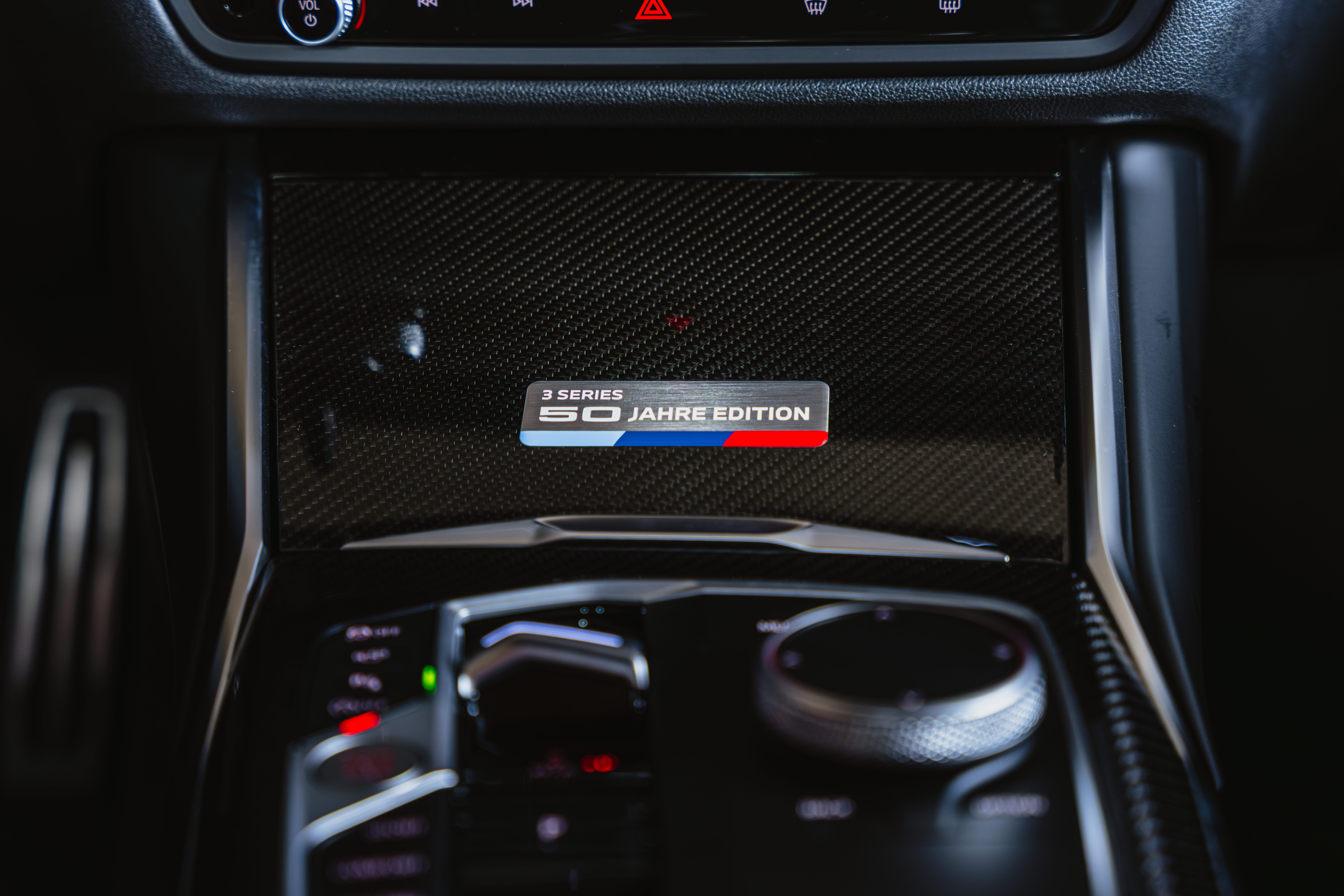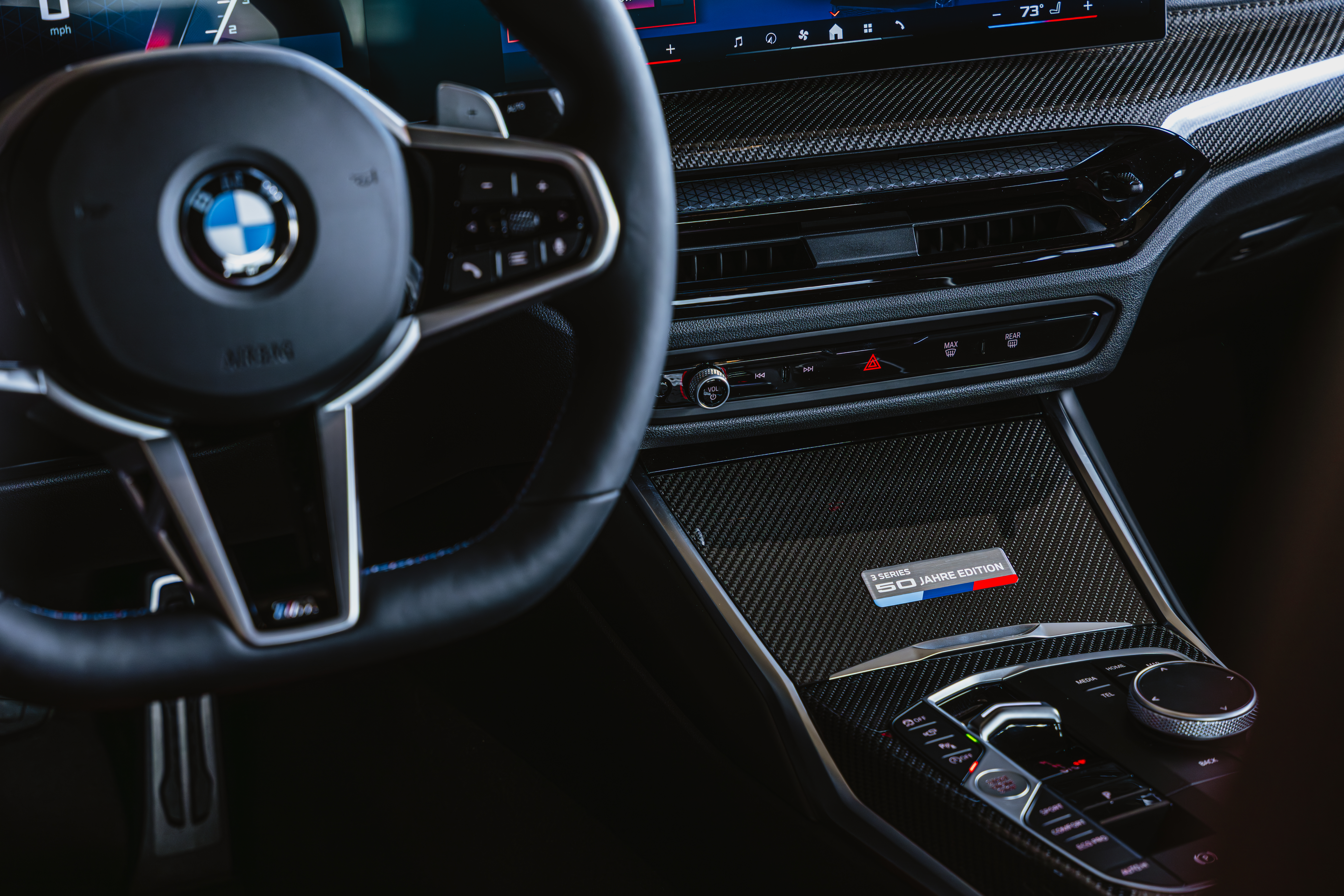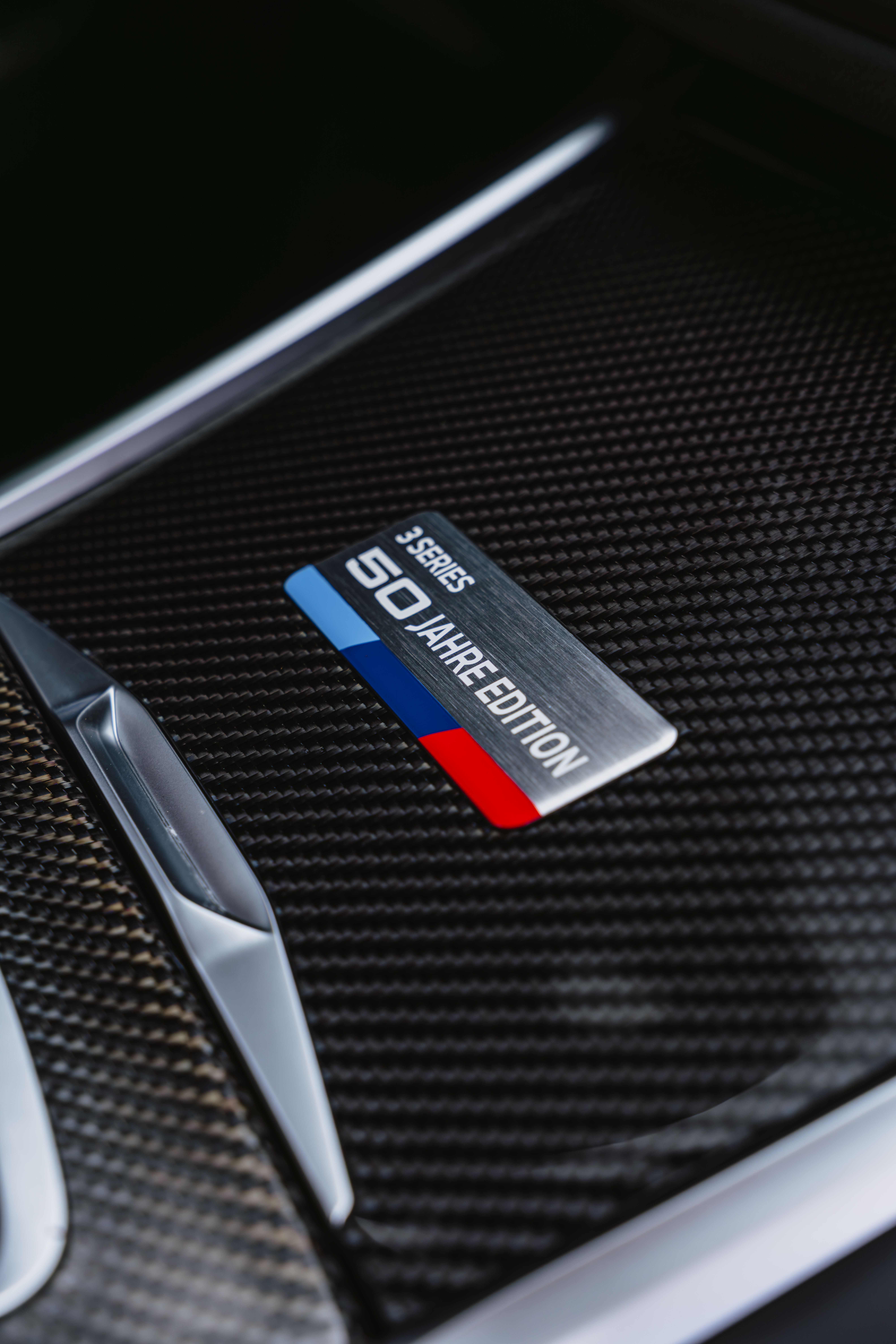 Moving inside, the aforementioned Extended Merino Leather interior of every 3 Series 50 Jahre Edition is elevated further by carbon fiber trim. A Harman Kardon surround sound system and the BMW Curved Display with Head-Up Display are included with the standard Premium Package. The front door entry sills and a metal plaque on the cupholder cover are inscribed with “3 SERIES 50 JAHRE EDITION”, adding another touch of exclusivity.