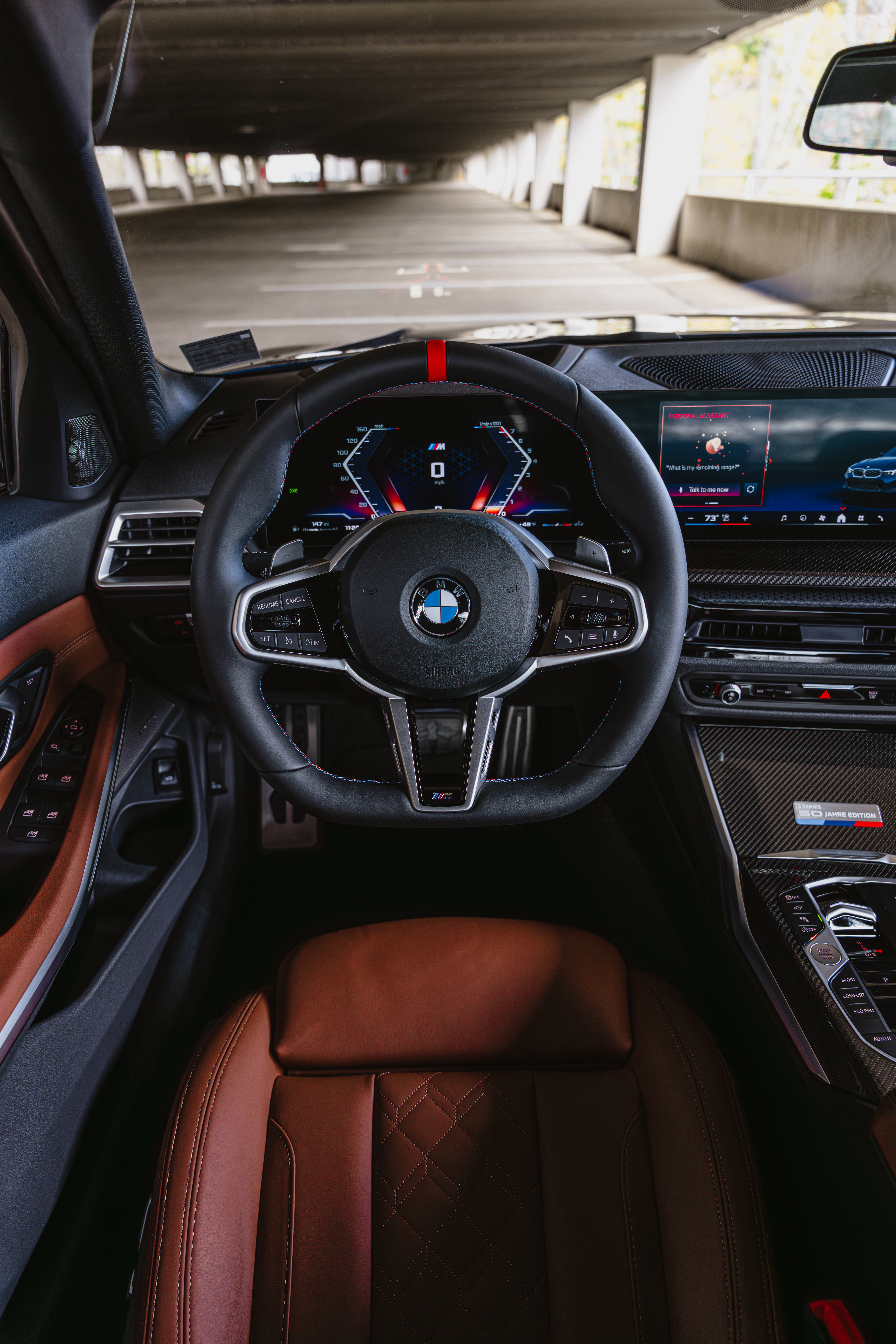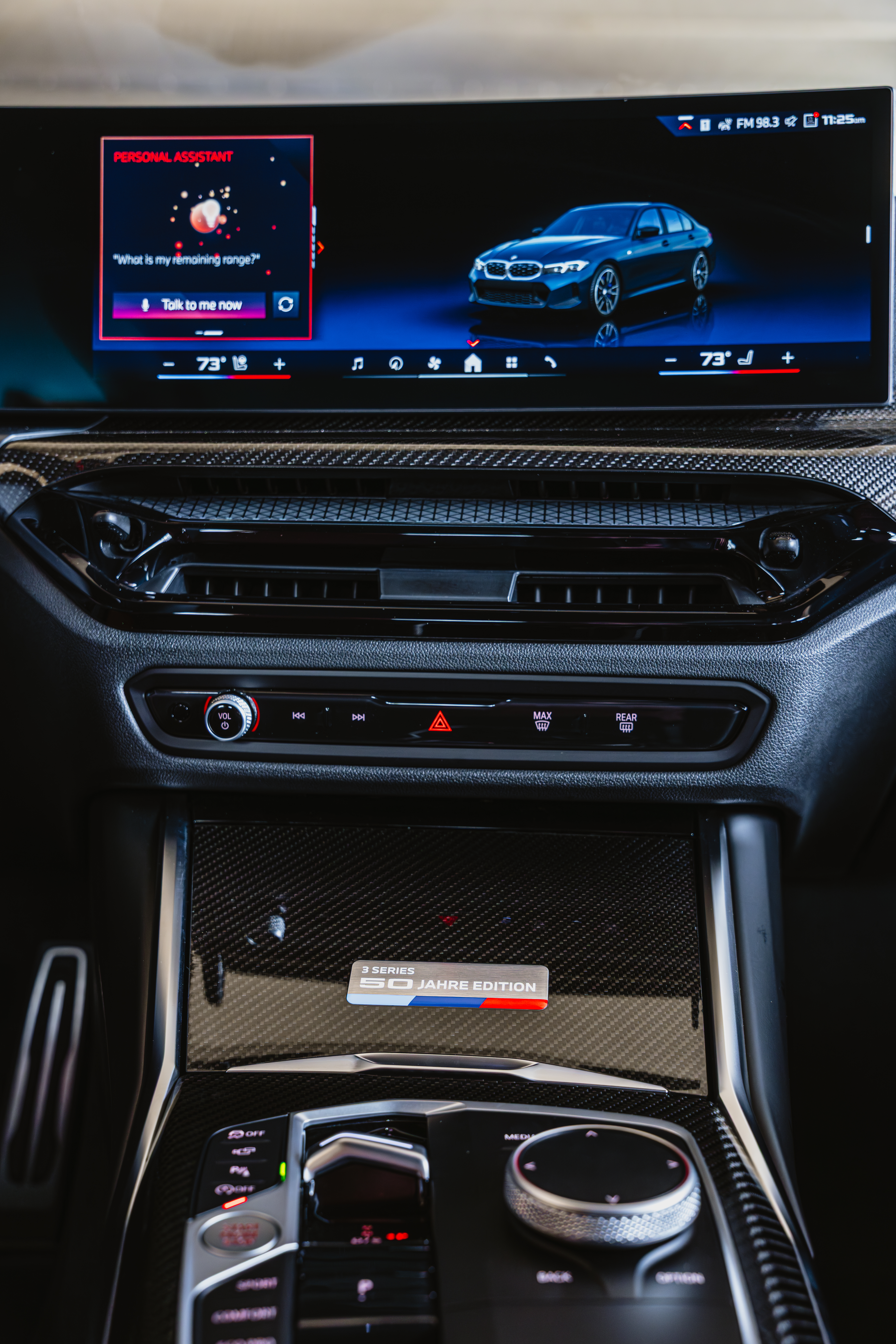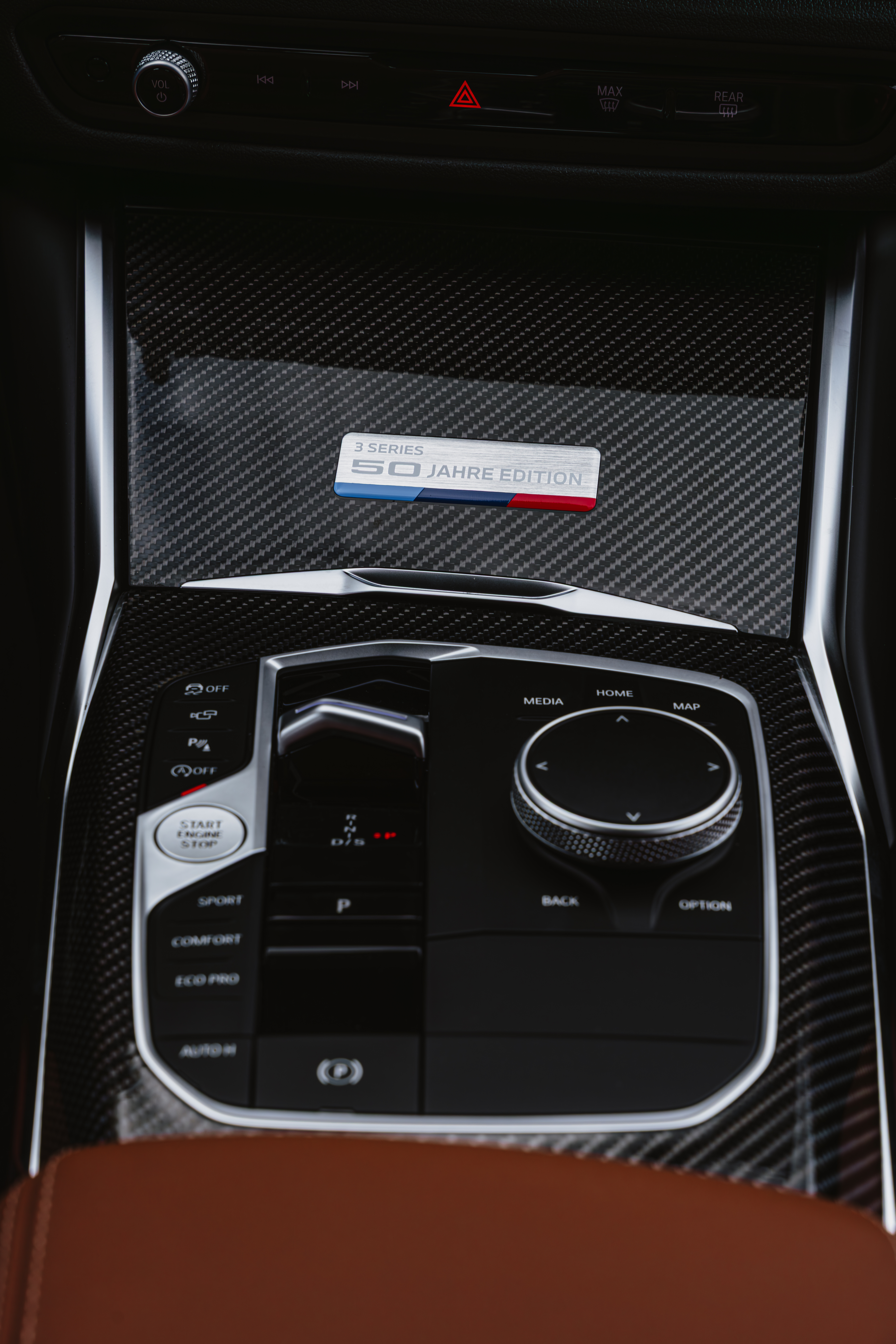 Moving inside, the aforementioned Extended Merino Leather interior of every 3 Series 50 Jahre Edition is elevated further by carbon fiber trim. A Harman Kardon surround sound system and the BMW Curved Display with Head-Up Display are included with the standard Premium Package. The front door entry sills and a metal plaque on the cupholder cover are inscribed with “3 SERIES 50 JAHRE EDITION”, adding another touch of exclusivity.